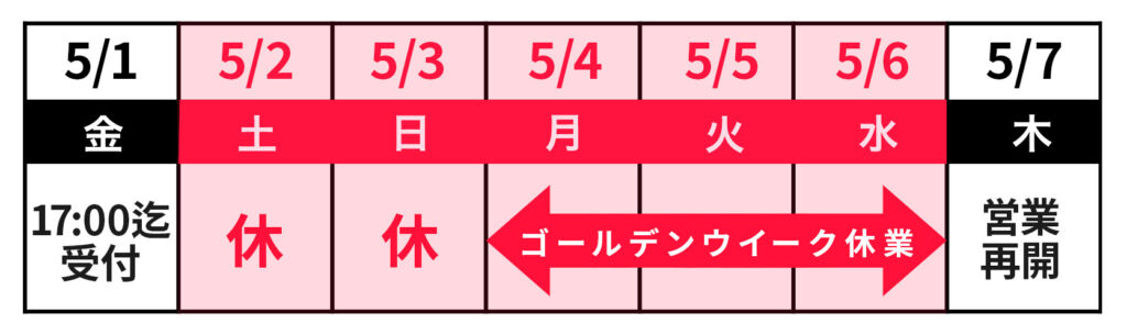 誠に勝手ながらゴールデンウィーク休業を下記の通りとさせていただきます。